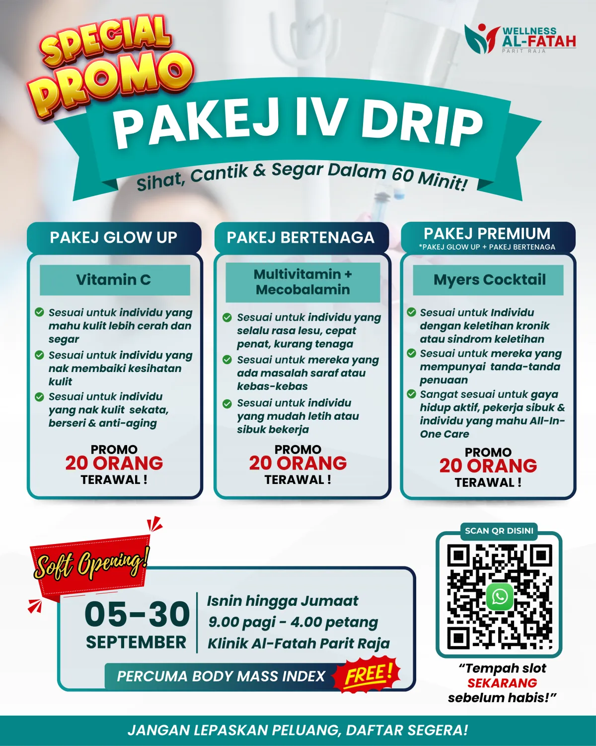 Kami menyediakan perkhidmatan iv drip vitamin bagi membantu menambah tenaga, menguatkan imun badan serta menyokong kesihatan kulit. Rawatan ini dijalankan oleh doktor berpengalaman menggunakan formulasi vitamin berkualiti yang dimasukkan terus ke dalam saluran darah untuk penyerapan lebih cepat dan berkesan.