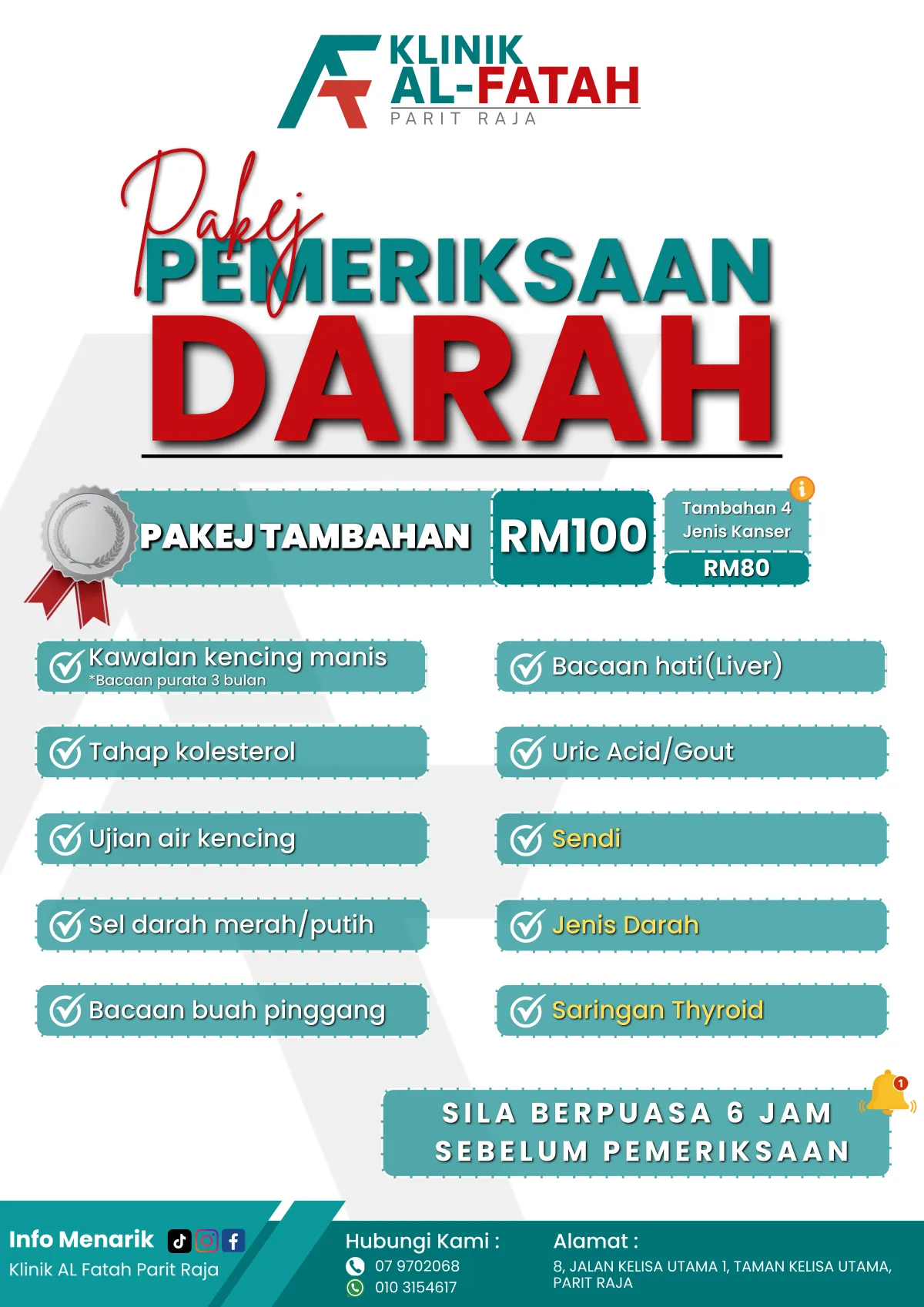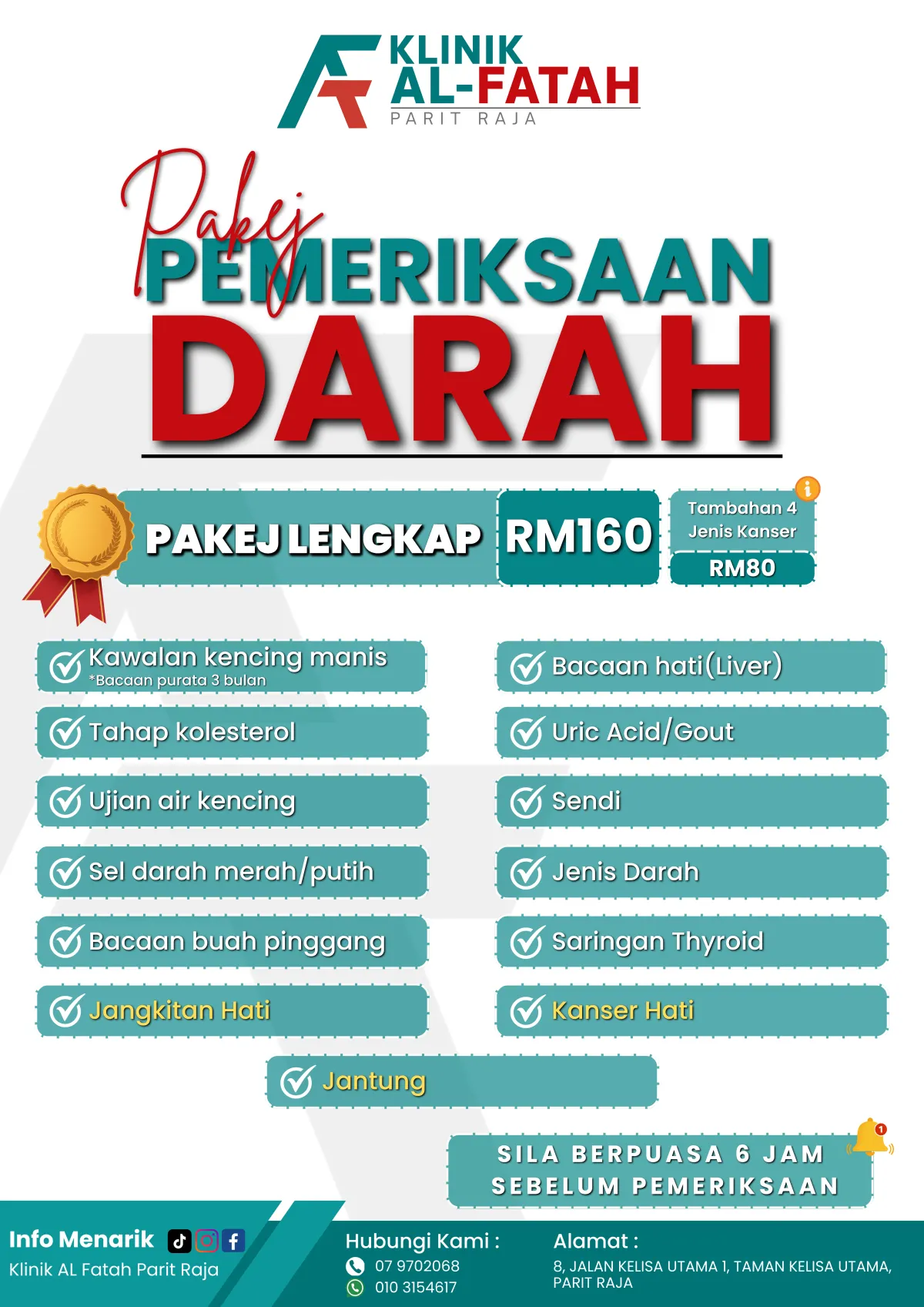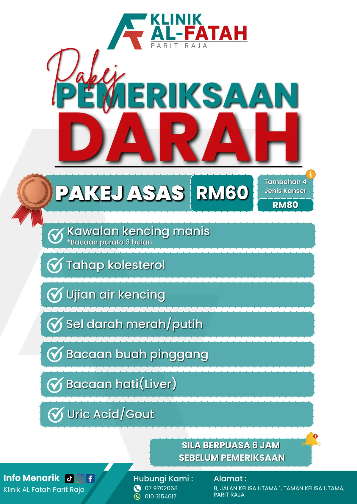 Kami menyediakan ujian pemeriksaan darah yang dihantar ke makmal bertauliah bagi memastikan keputusan lebih tepat dan menyeluruh. Terdapat tiga pilihan pakej mengikut keperluan anda: Pakej Asas untuk saringan awal kesihatan, Pakej Tambahan dengan ujian lebih mendalam, dan Pakej Lengkap yang merangkumi pemeriksaan menyeluruh bagi gambaran penuh tahap kesihatan anda.