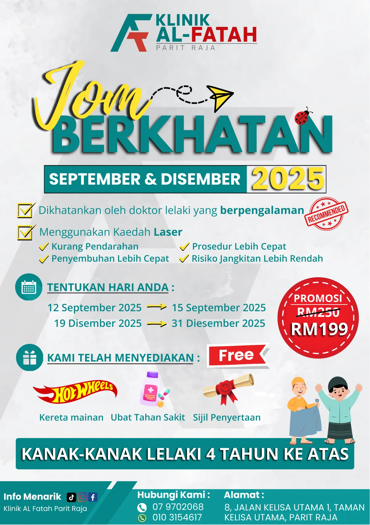 Dengan suasana klinik yang bersih, selesa dan mesra pesakit, kami pastikan proses khatan berjalan lancar, cepat sembuh dan memberi ketenangan kepada pesakit serta keluarga.